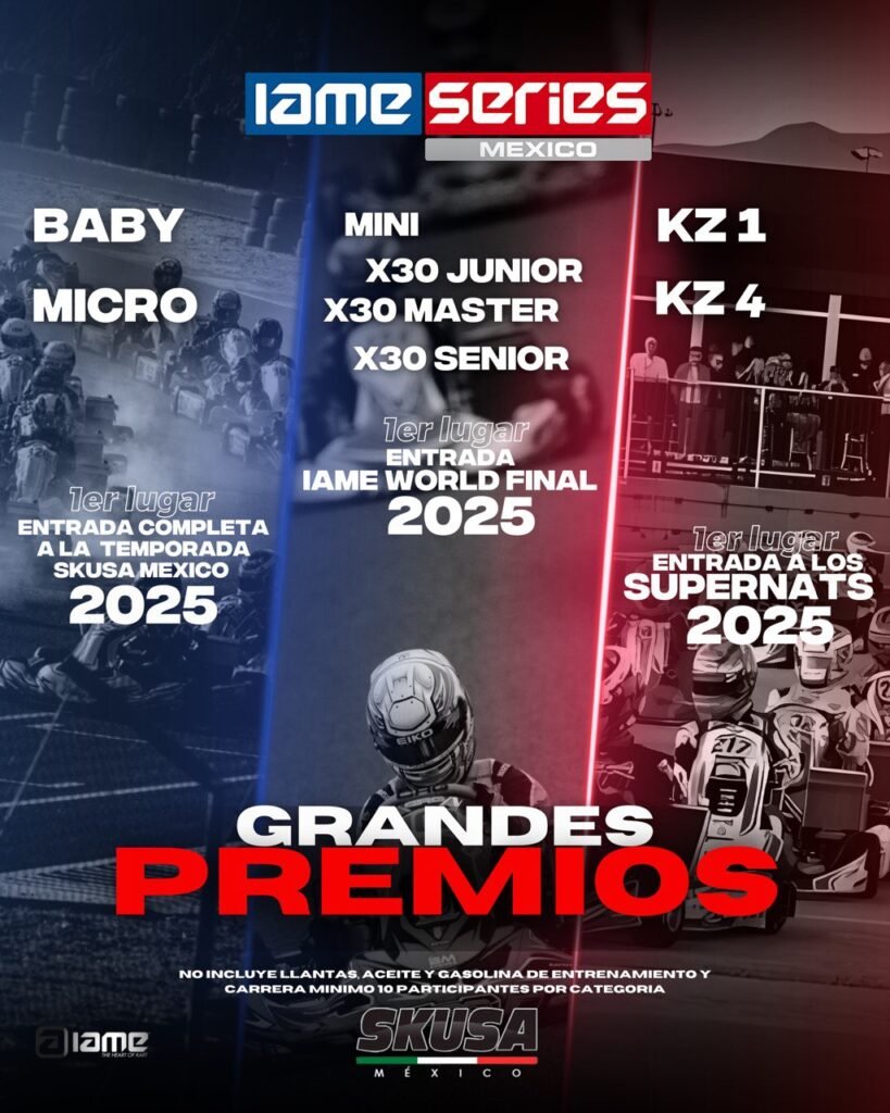 Los premios de IAME Series México varían según la categoría, brindando incentivos únicos para los pilotos. En las categorías Baby y Micro, el primer lugar obtendrá una entrada completa a la temporada SKUSA México 2025. Para las categorías Mini, X30 Junior, X30 Master y X30 Senior, el premio principal es una entrada completa para IAME World Final 2025, uno de los eventos más esperados del karting mundial. Por otro lado, los ganadores de las categorías KZ1 y KZ4 recibirán una entrada para los prestigiosos Supernats 2025. Cabe destacar que los premios no incluyen gastos adicionales como llantas, aceite y gasolina de entrenamiento y carrera, y que cada categoría debe contar con un mínimo de 10 participantes para que se otorguen estos premios.